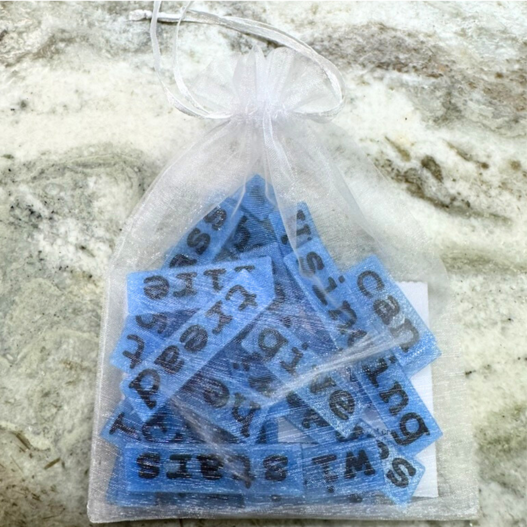 - Blocks are packaged in an organza bag, complete with a card featuring the original text.