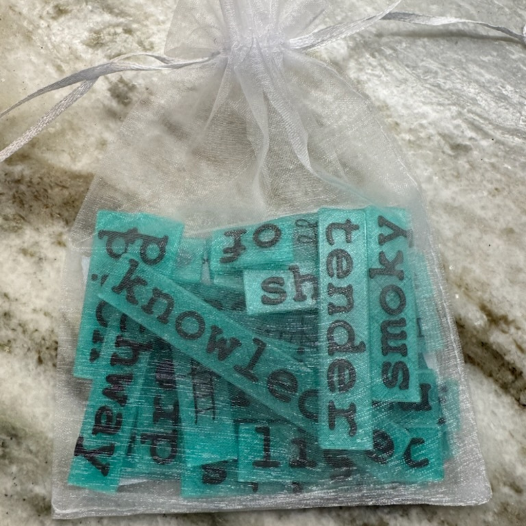 - Blocks are packaged in an organza bag, complete with a card featuring the original text.