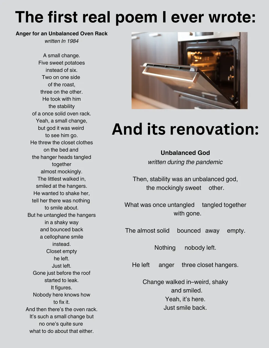 Anger For an Unbalanced Oven Rack is the first poem I ever wrote. I was 17 and my parents were divorcing. Laying my confusion and sorrow down on paper helped me heal.
